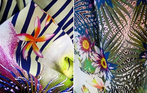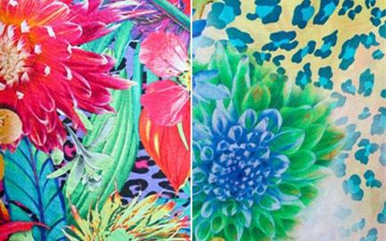 熱帶花朵混合重新著色的豹紋圖案,打造出叢林景象圖案的外觀,成為本季兩大潮流元素趨勢。動物紋理充滿整個背景色;精細(xì)設(shè)計的簇?fù)矶c(diǎn)熱帶花朵;黑色及白色傾瀉動物圖案漸漸退變?yōu)榇負(fù)砘ǘ鋱D案,打造出抓人眼球的邊花外觀。