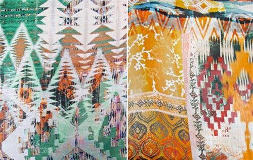 民族風(fēng)情的圖案互相交融在一起,形成艷麗紋理感的拼縫外觀。新潮流取代上季部落風(fēng)印花圖案;古舊感處理呈現(xiàn)出復(fù)古風(fēng)紋理外觀;圖案疊搭、合并及拼湊在一起,全球各地的民族印花風(fēng)情水乳交融。